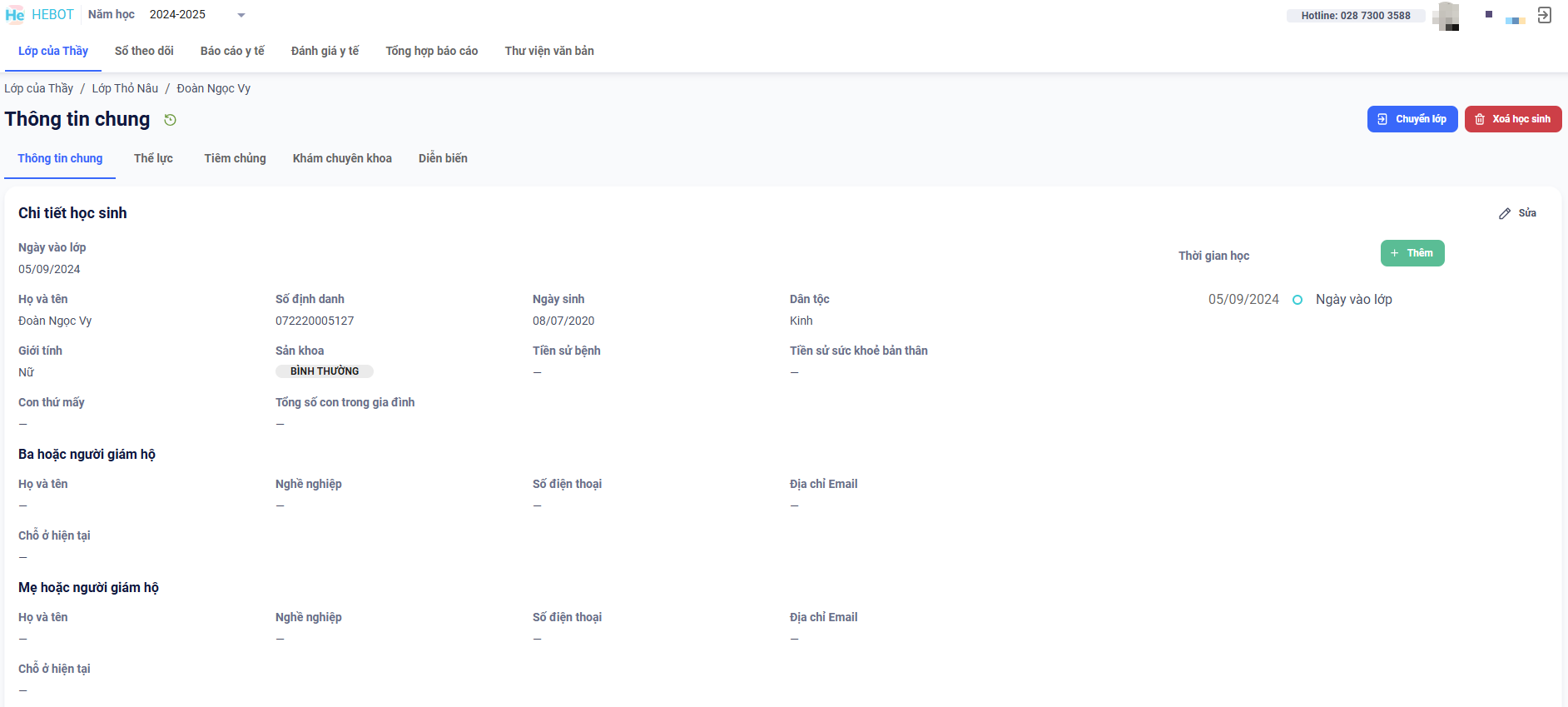 Bước 2: Giao diện thông tin chung của học sinh như hình