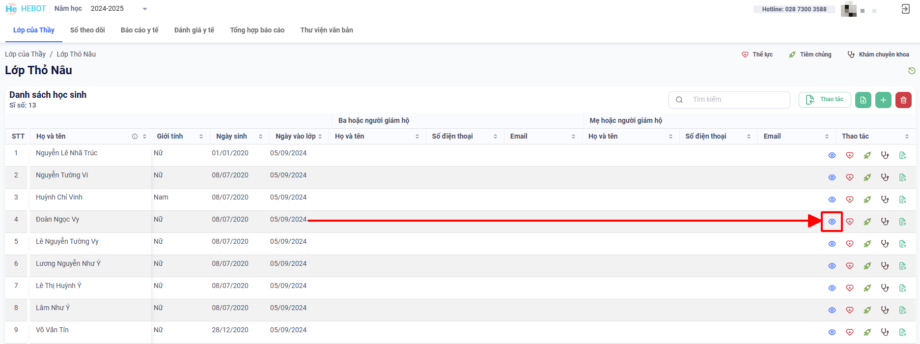 Bước 1: Chọn biểu tượng con mắt ở hàng học sinh Cô muốn xem